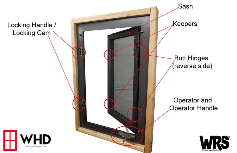 The main parts include the sash, frame, glazing bead, weather stripping, hinges, and locking mechanism. Each part ensures stability, insulation, and security for the window.